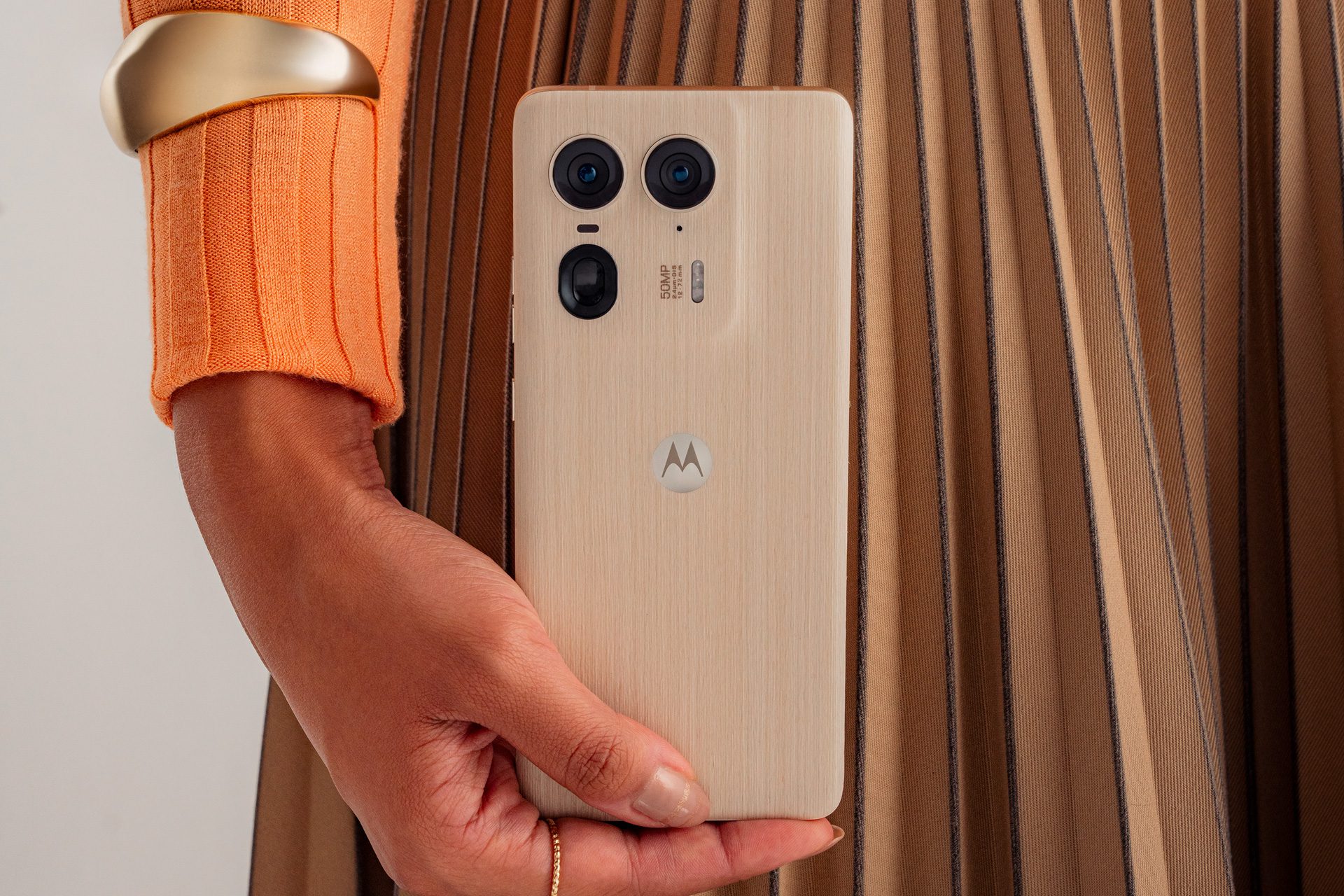 motorola edge 50 ultraEl motorola edge 50 ultra refleja el enfoque de Motorola en el diseño y ha sido desarrollado para impresionar incluso al usuario de smartphone más exigente. Con sus cómodas curvas, materiales de primera calidad como la madera auténtica y el cuero vegano, además del color Pantone del Año, Peach Fuzz, este dispositivo es más que un smartphone: es una obra de arte. Un delgado marco de aluminio arenado, Corning Gorilla Glass Victus y la protección contra el agua IP683 garantizan que el diseño de primera calidad cumpla tanto con el diseño como con la función, para que los consumidores puedan llevarlo a cualquier parte sin preocuparse por su durabilidad.